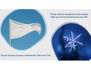 Vakantie 21.okt.2025 Packo zal gesloten zijn op vrijdag 10 en zaterdag 11 november. Van 24 december tot en met 4 januari is Packo gesloten wegens de eindejaarsperiode. Vanaf 5 januari staan we weer voor u klaar! Terug naar het nieuwsoverzicht